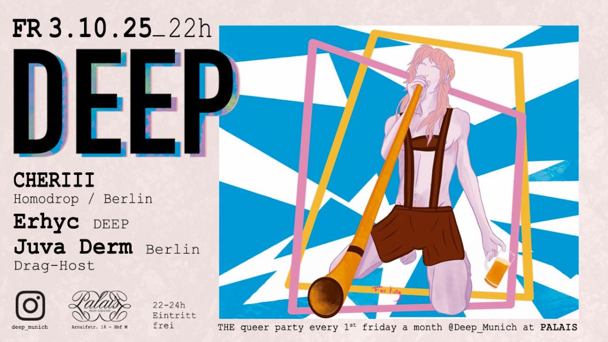 Heuer, am Feiertag, der zugleich das letzte Wiesn-Wochenende einläutet, begrüßen wir bei DEEP neben unserem Master of Ceremony Erhyc noch zwei Special Guests aus der Bundeshauptstadt: CHERIII an den DJ-Decks und Juva Derm Nightstand in der Rolle des Drag-Hosts.