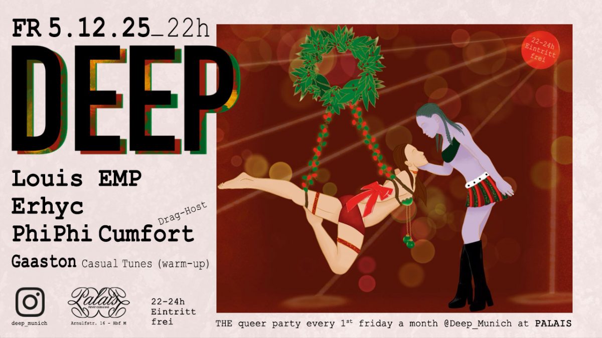 Bei der weihnachtlich angehauchten Ausgabe unseres DEEP-Events im Dezember schneien mit Louis EMP, Erhyc und Gaaston an den Schiebereglern sowie Drag-Host PhiPhi Cumfort mit herausragenden Fähigkeiten an der empfängnisbereiten Charme-Klaviatur gleich vier wunderbare Flocken-Köpfe herein. Für die ersten tänzerischen Aufwärmrunden ist Gaaston zuständig. Hinter dem Künstlernamen steckt der Tunesier Ghassen, der mit diesem Projekt die tieferen Schichten von Klang, Rhythmus und Atmosphäre aufbohrt und zeigt, wie Klang Menschen bewegen und zu Resonanzen führen kann – emotional, physisch und kollektiv. Kollektive Ekstase ist auch die Zielrichtung bei Louis EMP, Resident-DJ bei den Garry-Klein-Partys und Mitbegründer der queeren Eventreihe Perras. In seinen dynamischen Sets schraubt er am liebsten sorgfältig selektierte Sound-Collagen aus klassischem Chicago- und New-York-House und modernerem Tech-, Progressive- und Tribal-House zusammen. Auf jeden Fall kommt dabei eine wunderbare Vorlage für DEEP-Begründer Erhyc heraus, der dann bis um 4 Uhr den Part des Mischpult-Masterminds übernimmt. Er wird wieder mal feinsten hip shakin’ House mit Tribal-Elementen und technoiden Ausflügen durch die Boxen pumpen und die Community auf dem Floor nicht mehr vom Angelhaken lassen.