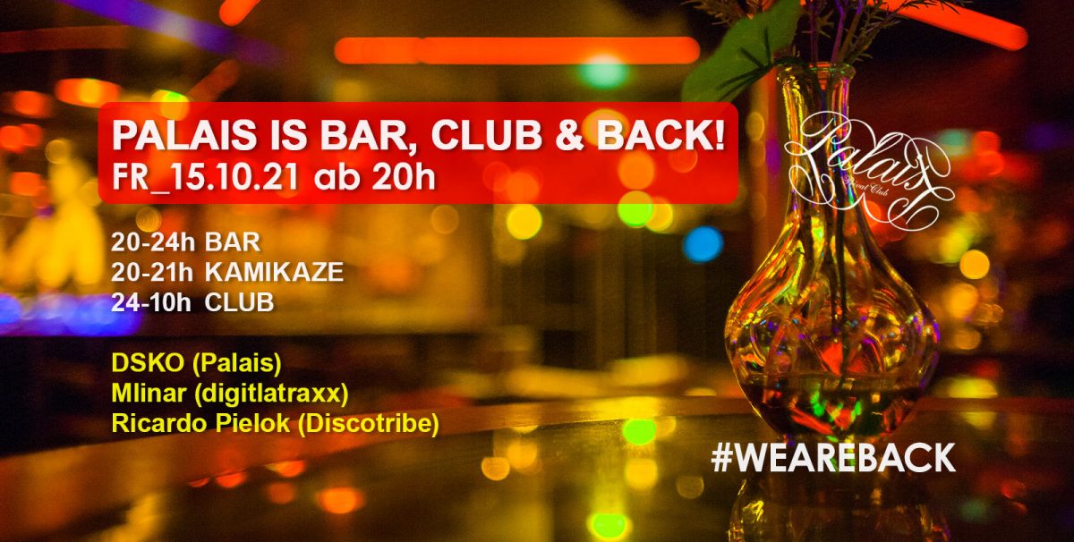 Nach über 18 Monaten Corona-Zwangs-Schließung ist nun auch das PALAIS endlich zurück… und zwar als BAR & CLUB jeden Freitag, Samstag und vor Feiertagen!